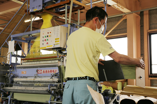 ポリプロピレン製のゴザを織機で生産しています。材料を織機に乗せることからミシンをかけて折りたたむまで様々な工程があります。