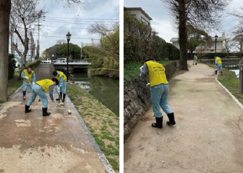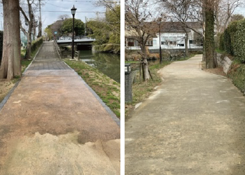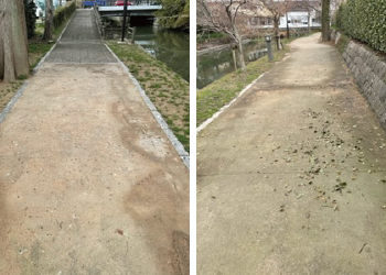 柳川市の委託を受けて市内の遊歩道などの清掃作業を行っています。落ち葉の撤去・草取り・鳥の糞で汚れた場所の清掃が主な作業です。