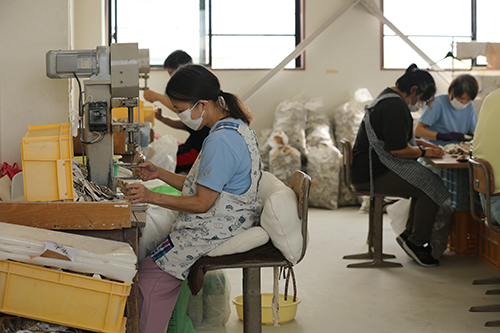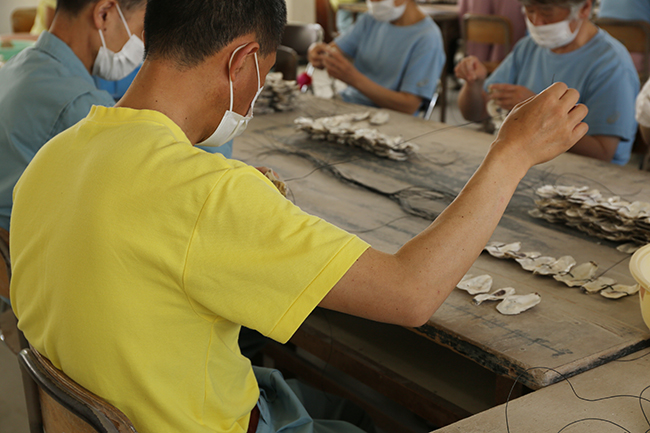 地場産業である有明海のノリ養殖に欠かせない種付け用のカキの貝殻に穴をあけひもでつなげる作業です。貝の大きさや向きを合わせたりつなぐ糸の緩さなど注意点がいくつかあります。
